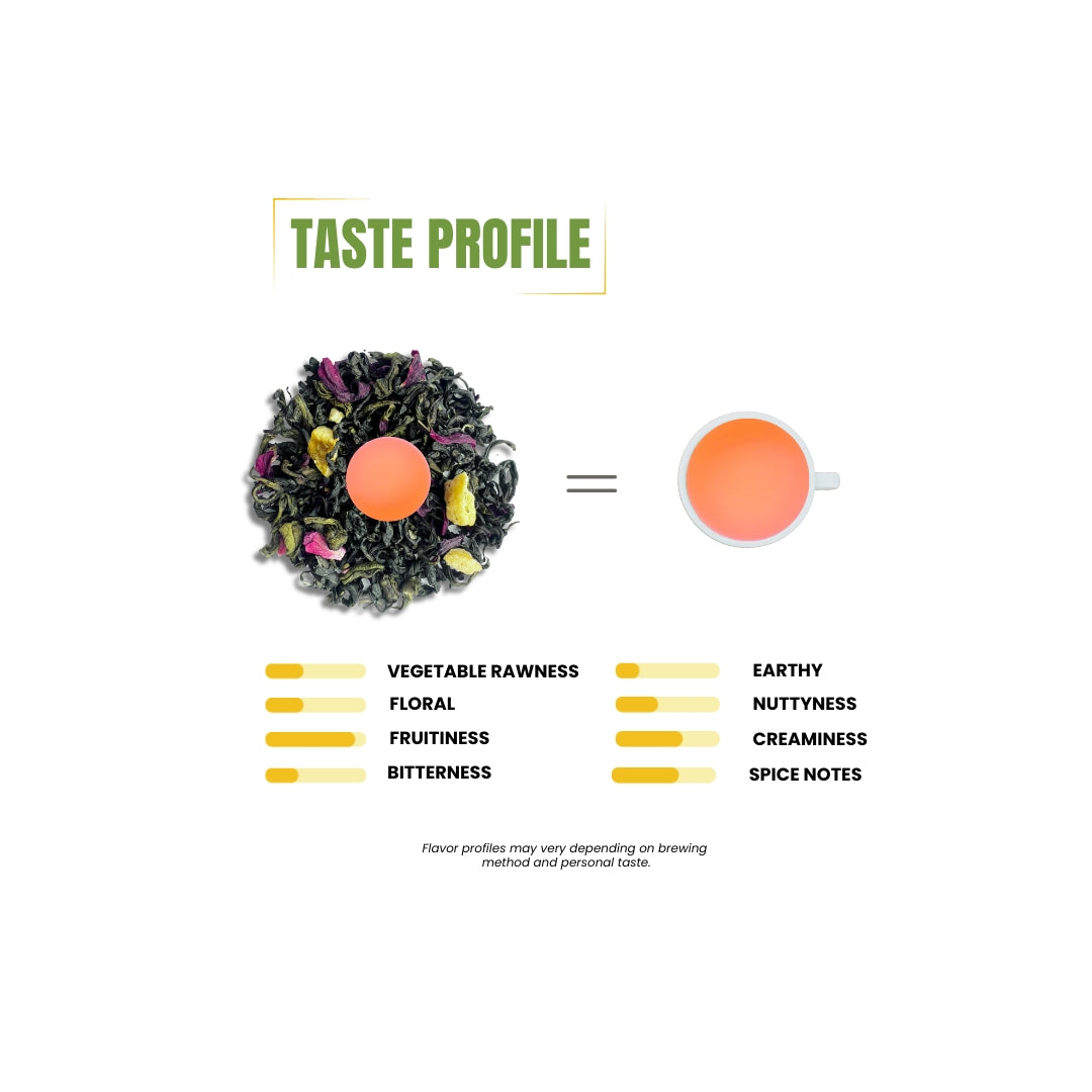 Bright peach-forward aroma that greets you first. Soft vegetal green tea base providing structure. Light tang from hibiscus adding dimension. Clean, refreshing finish that invites another sip. Low bitterness and genuinely smooth body.This is what fruity green tea should taste like.