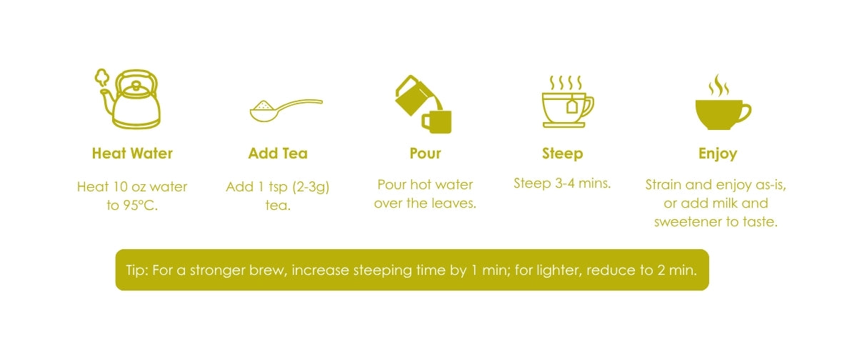 Use 2–2.5 grams per 8–10 oz of water. Heat water to 205°F. Steep for 3–4 minutes. For a richer, more brothy cup, steep closer to 4 minutes. This loose leaf black tea can be re-steeped once or twice.